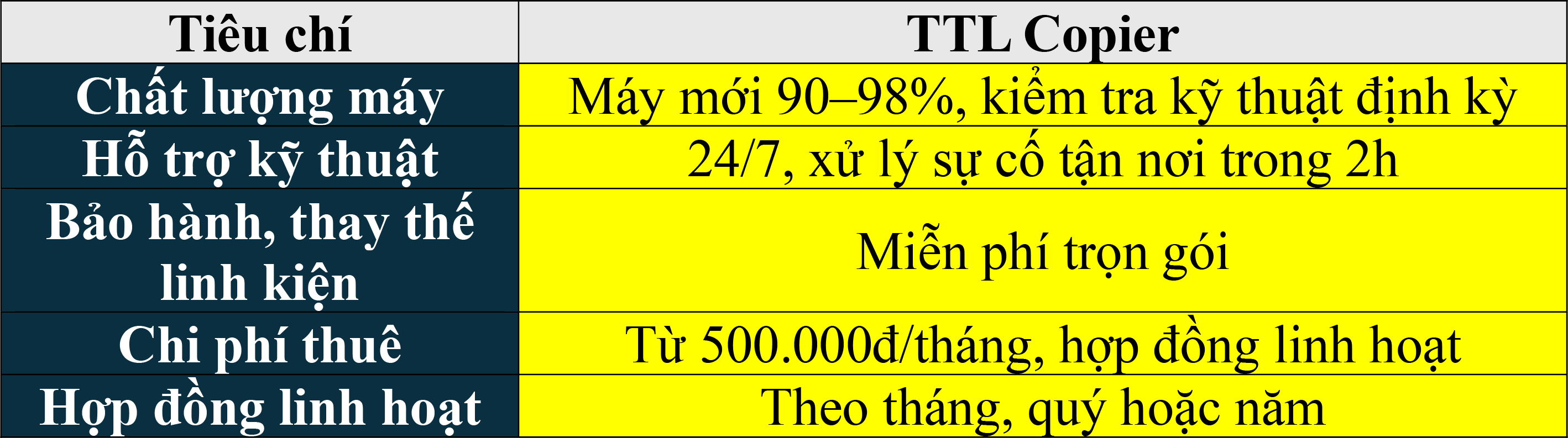 TTL Copier cam kết: không phát sinh chi phí ẩn, miễn phí thay mực – linh kiện trong suốt thời gian thuê.