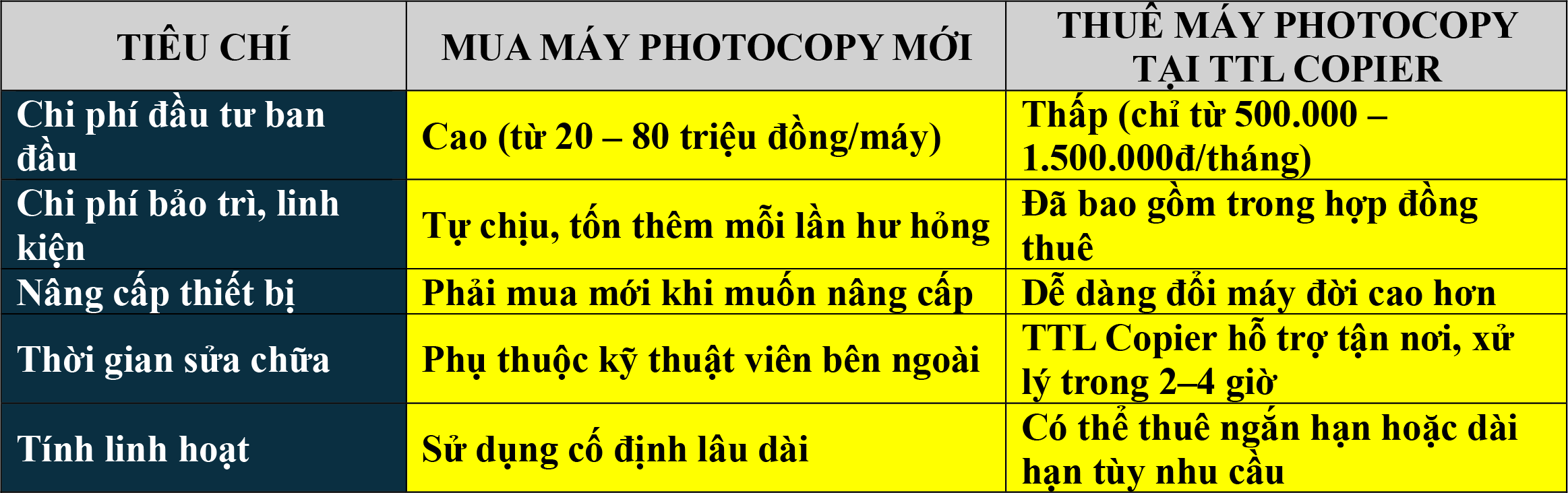 Kết luận: Với các doanh nghiệp vừa và nhỏ, lựa chọn thuê máy photocopy TTL Copier giúp giảm tới 60% chi phí vận hành, đồng thời đảm bảo hiệu suất và chất lượng in ấn ổn định.