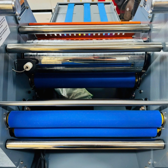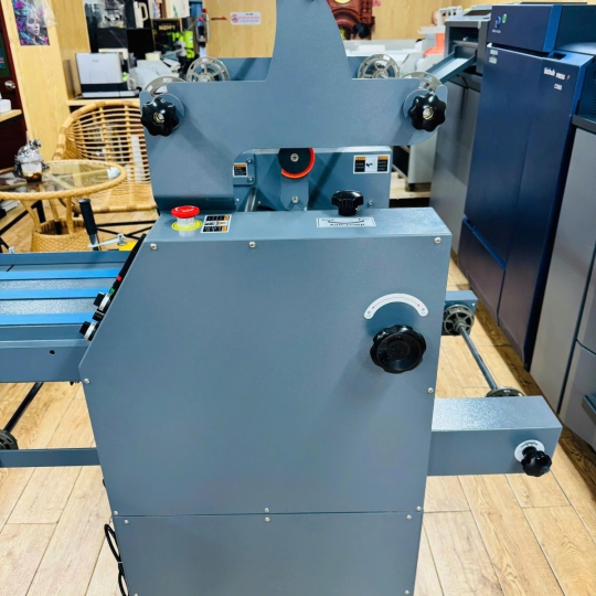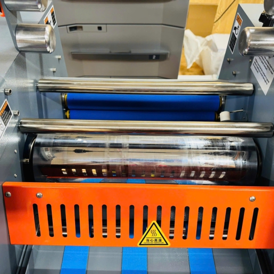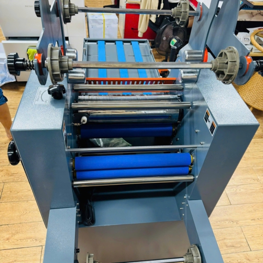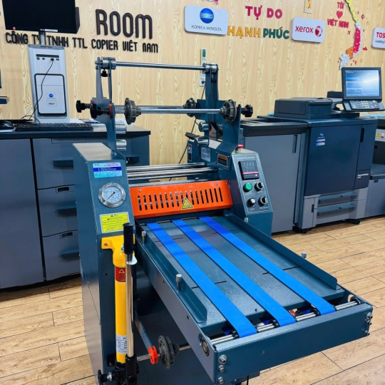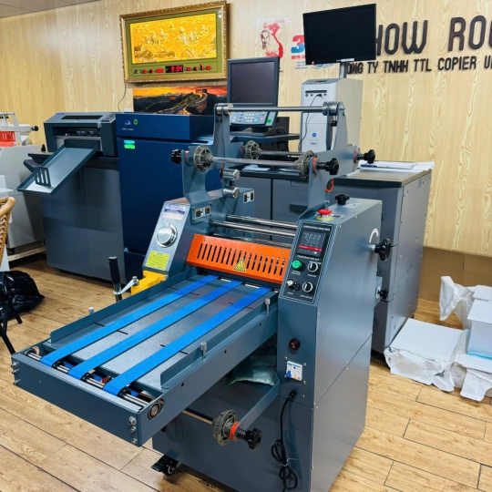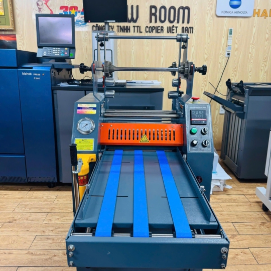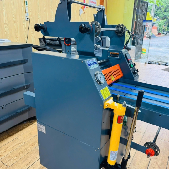 Máy có hệ thống cấp giấy tự động, ép áp lực cao nhờ bộ truyền lực thủy lực, cùng với hệ thống điều khiển nhiệt độ chính xác để đảm bảo lớp màng bám chặt, không bong bóng, không nhăn mép.